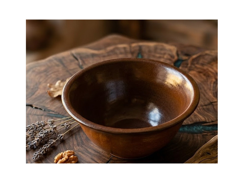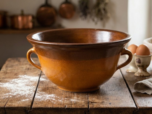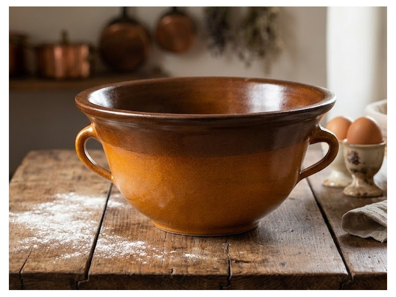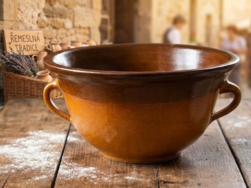 Povrch je opatřen kvalitní dvoubarevnou hnědou glazurou, která je nejen vysoce odolná proti mechanickému poškrábání, ale také se velmi snadno udržuje. Ergonomicky tvarovaná ucha zajišťují pevný úchop, i když máte ruce od mouky. Tento kousek není jen obyčejnou mísou – je to kus řemeslné historie, který se ve vaší rodině bude dědit po generace a stane se dominantou každé rustikální kuchyně.