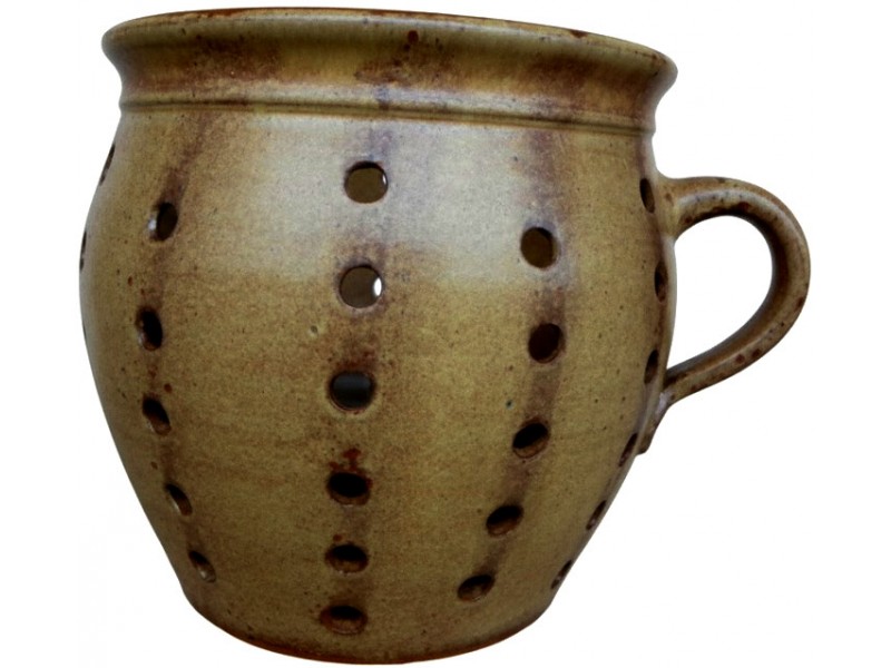 Hrnec dírkovaný, u Nás na chodsku takz. hrachovec, původně určený na výrobu povidel. Dneska se povidla moc nedělají,A je to škoda. Kdysi se používal jako velký cedník, na scezení nudlí, vařené zeleniny, masa. Anebo vhodný k uskladnění potravin,(cibule,česneku atd) Objem asi 2 litry.Sloužil velice dobře a spolehlivě.Je to původní nádobí, které se vyrábělo ,co lidé začali s keramikou. Ale i dnes je to pěkná a funkční věc a své místo si u vás určitě najde.