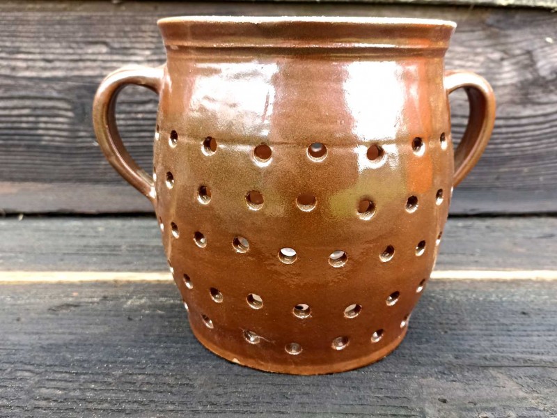 Cedník (hrachovec), asi 1,5 litru. Keramická nádoba s dírkami na cezení, třeba nudlí.