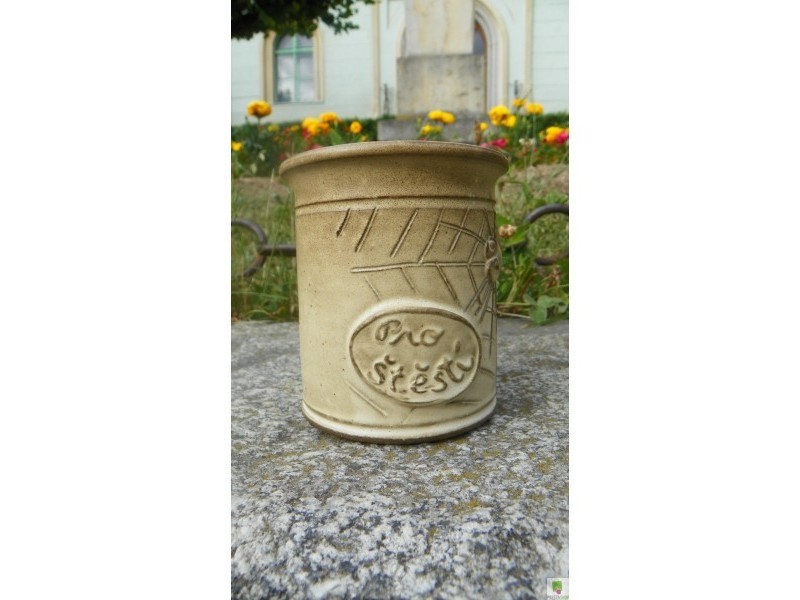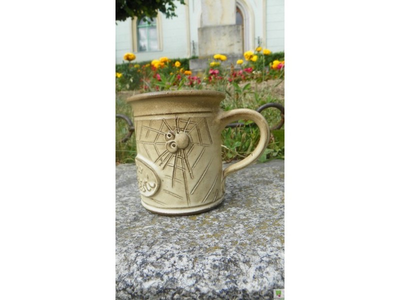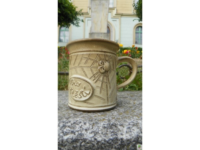 Hrnek ,pro štěstí s pavoučkem.Asi 2dcl,akorát tak na ranní nebo odpolední kávu.Kameninový hrnek je z velmi odolné hmoty ,,kameniny"Rozdíl mezi keramikou a kameninou je ve složení keramické hmoty.Kamenina je složenina alespoň ze čtyř složek(různá ostřiva a šamotové přísady) a vyšší vypalovací teploty.Ale jinak je kameninový hrnek velmi příjemný do ruky.Je to prostě jiné,ale příjemné. a hlavně do ruky padne.Oblíbíte si ho.