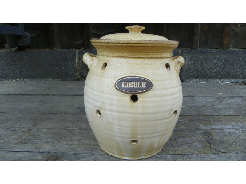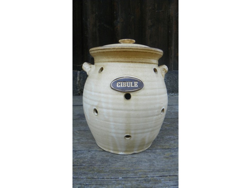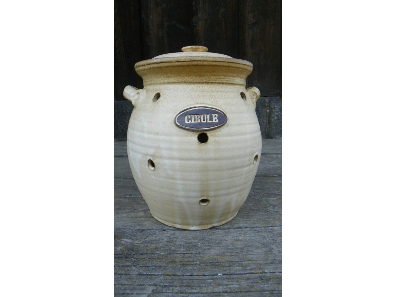 Doza na uskladnění cibule s dírama. Ty dírky jsou tam kvůli proudění vzduchu.Nezdá se to, ale vzduch, který proudí dírkama,vytváří malý průvan a cibule nehnije.Jednoduché až geniální.